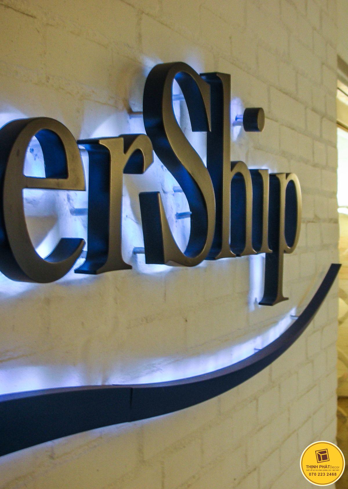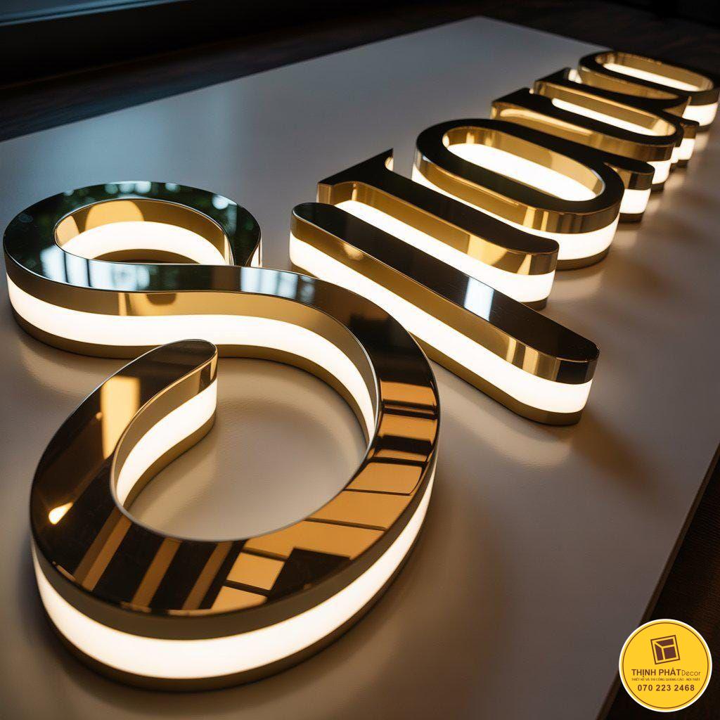 Với cấu tạo, gồm phần mặt chữ và hông chữ là inox 304 (gương, xước). Hệ thống đèn led ẩn bên trong chữ, hắt sáng ngược vào bền mặt nền Alu. Mặt đáy là lót mica đục để ánh sáng tỏa đều, không bị đốm.
