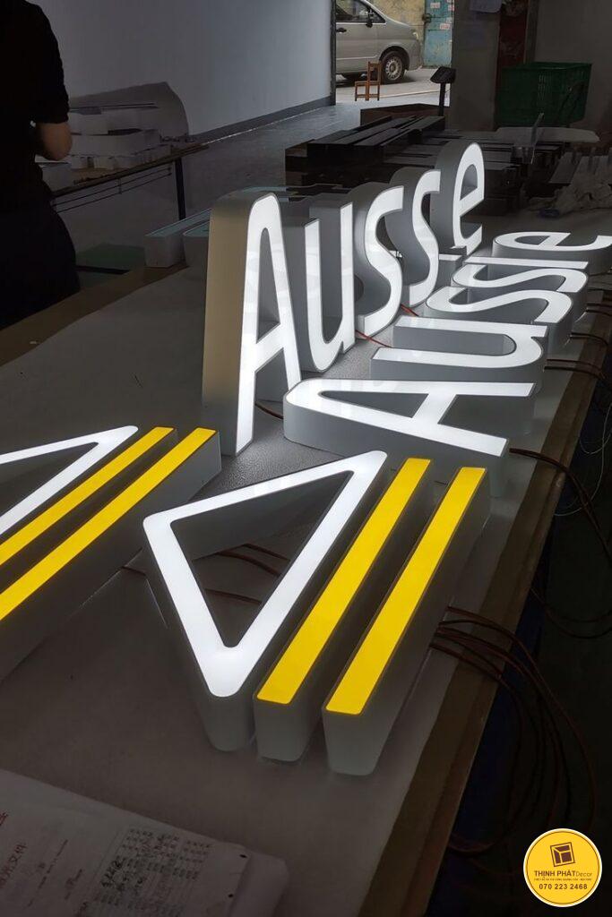 - Chữ nổi mica gắn LED – ánh sáng hắt chân, sáng viền hoặc full mặt chữ, cực kỳ bắt mắt ban đêm.