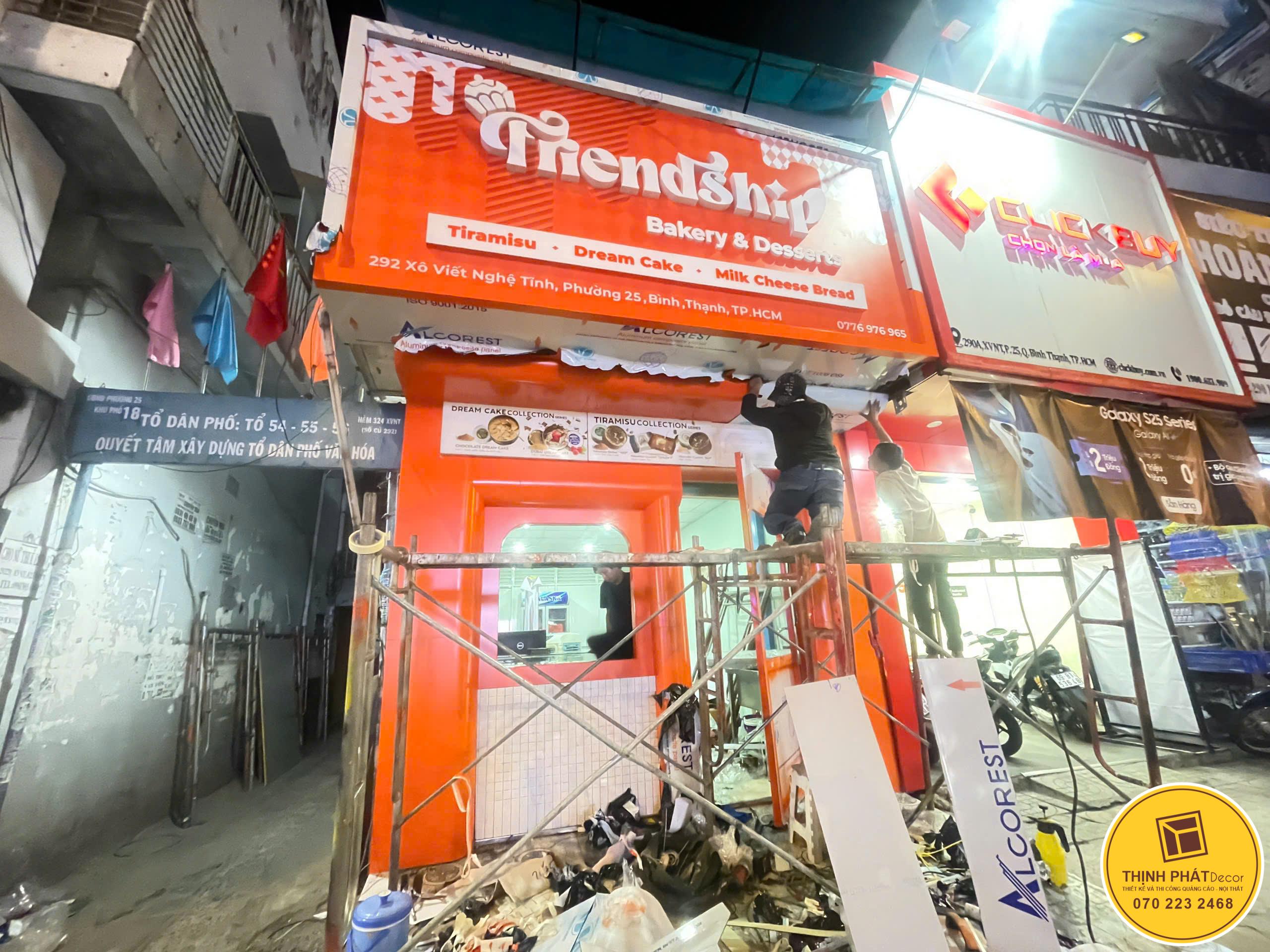- Thi công biển alu mặt tiền: dựng khung, bọc alu, xử lý mối nối, chống nước.