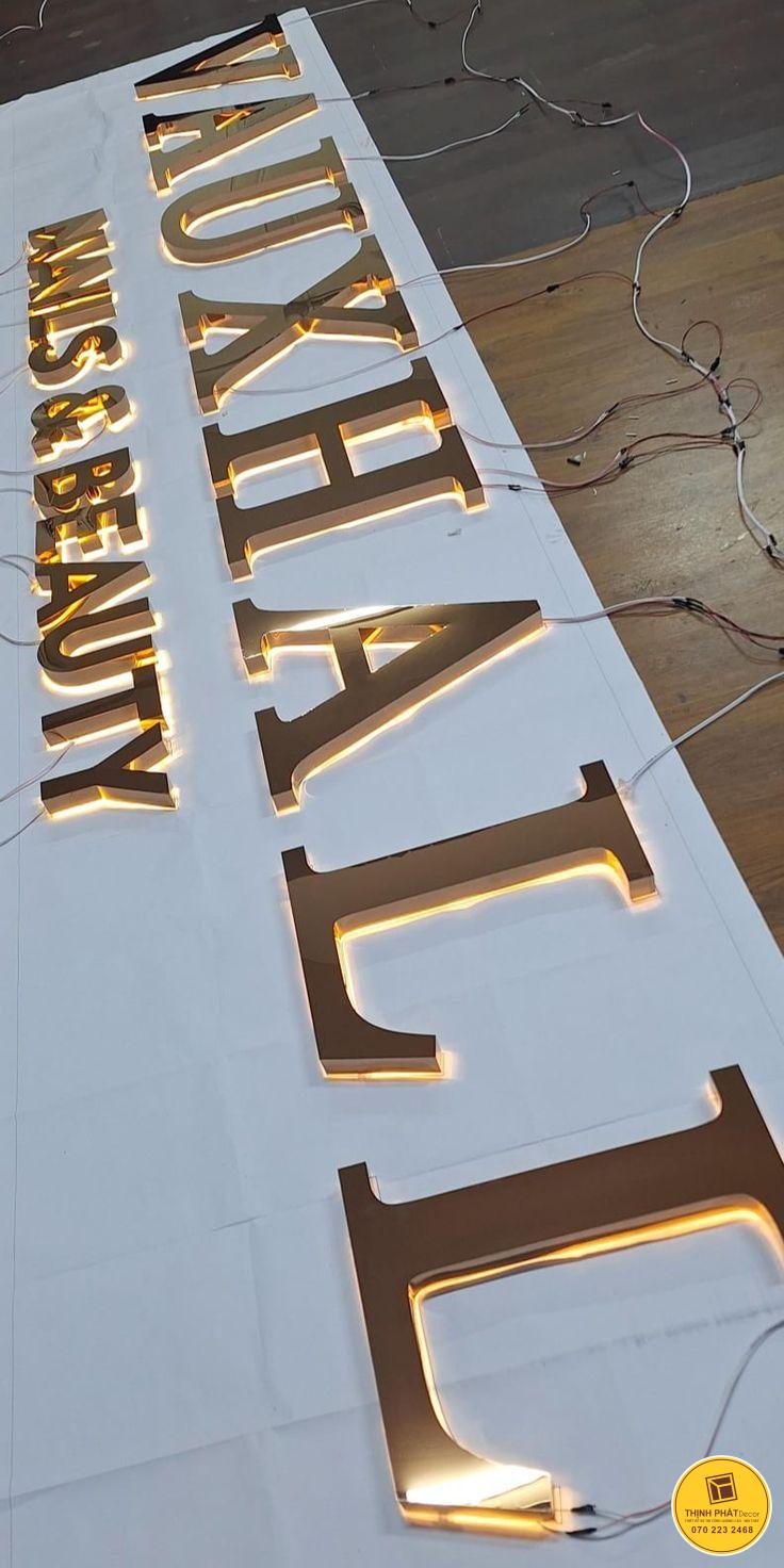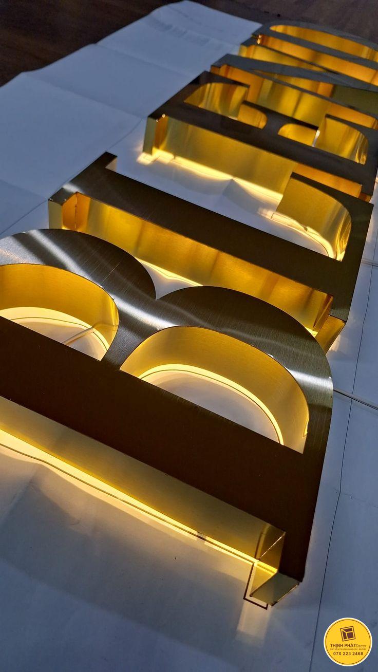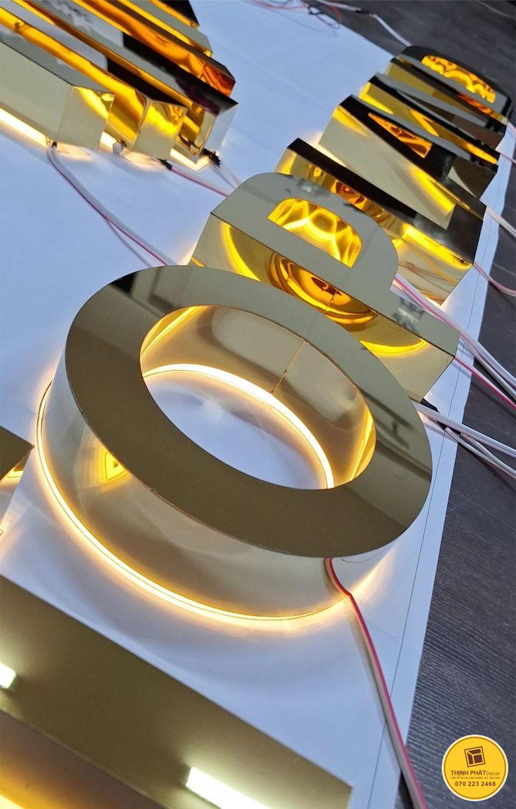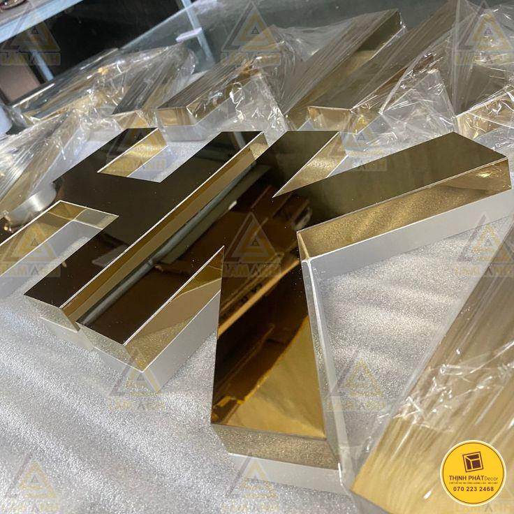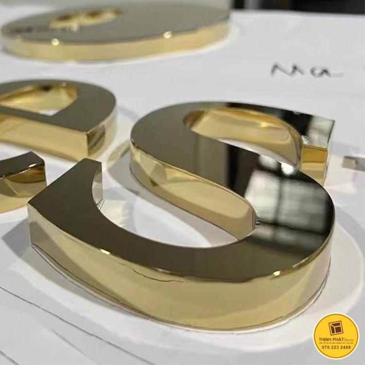 Chữ inox vàng hắt sáng: Loại chữ này mang vẻ sang trọng, tinh tế và nổi bật, phản chiếu ánh sáng tự nhiên tạo điểm nhấn mạnh mẽ. Phù hợp cho showroom, spa, nhà hàng hoặc các không gian cần sự nổi bật. Chữ inox vàng hắt sáng giúp thương hiệu dễ dàng ghi dấu ấn trong mắt khách hàng, thể hiện đẳng cấp và sự chuyên nghiệp.